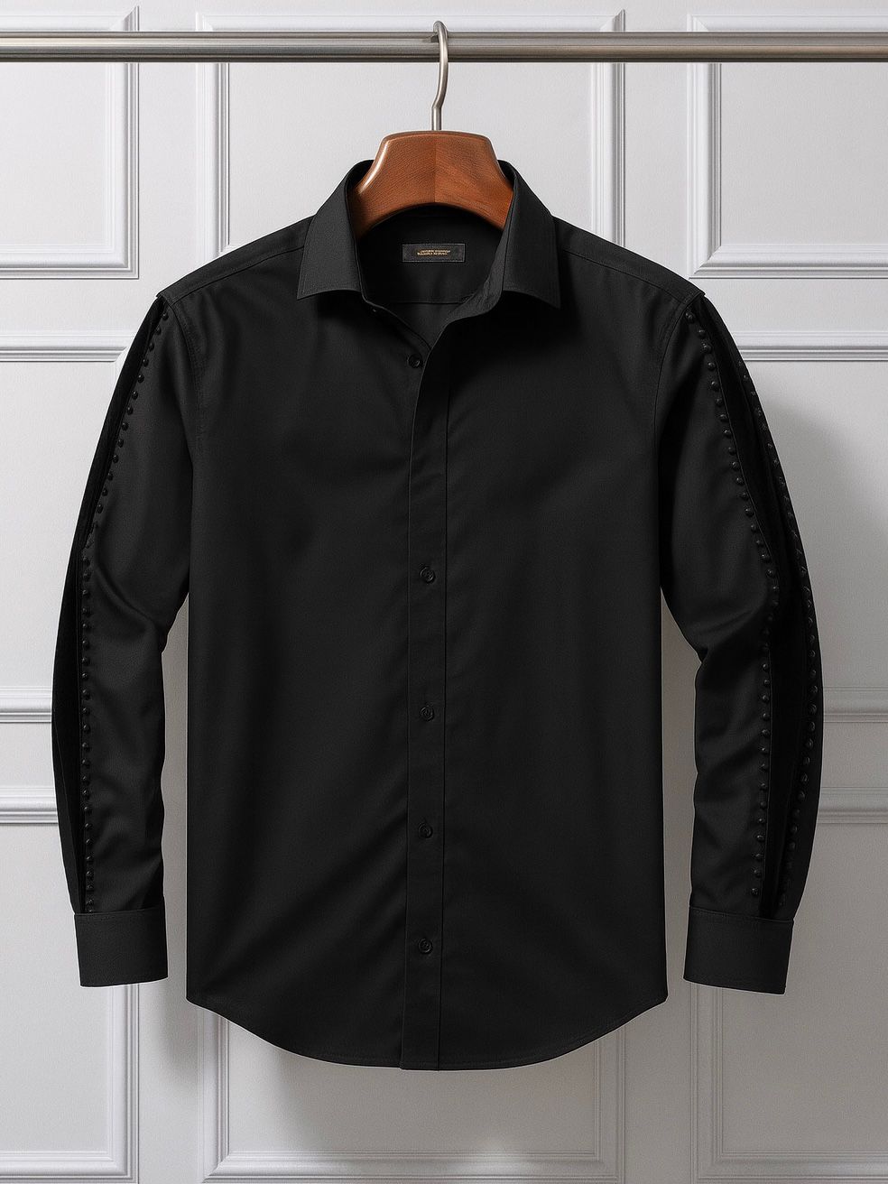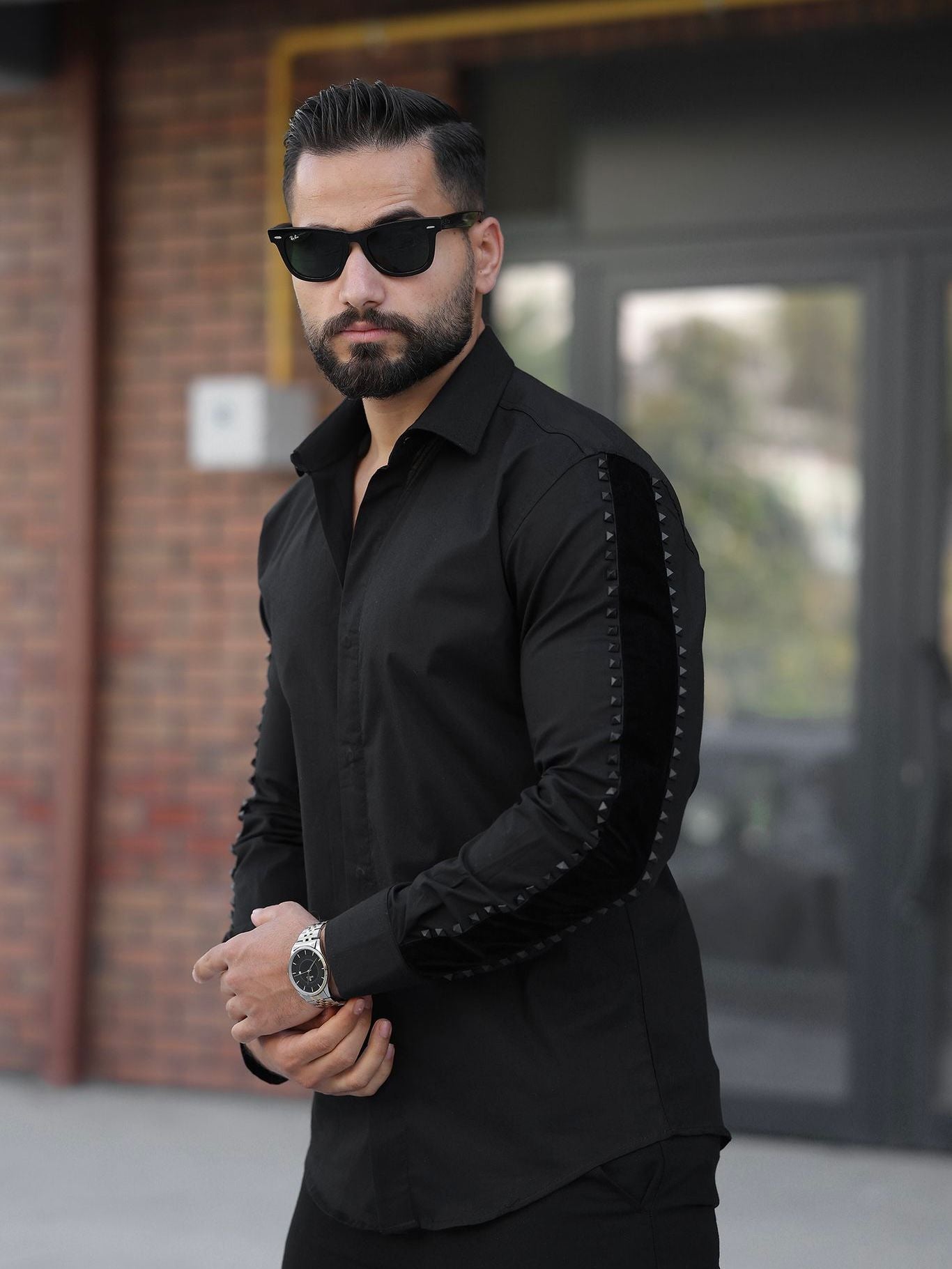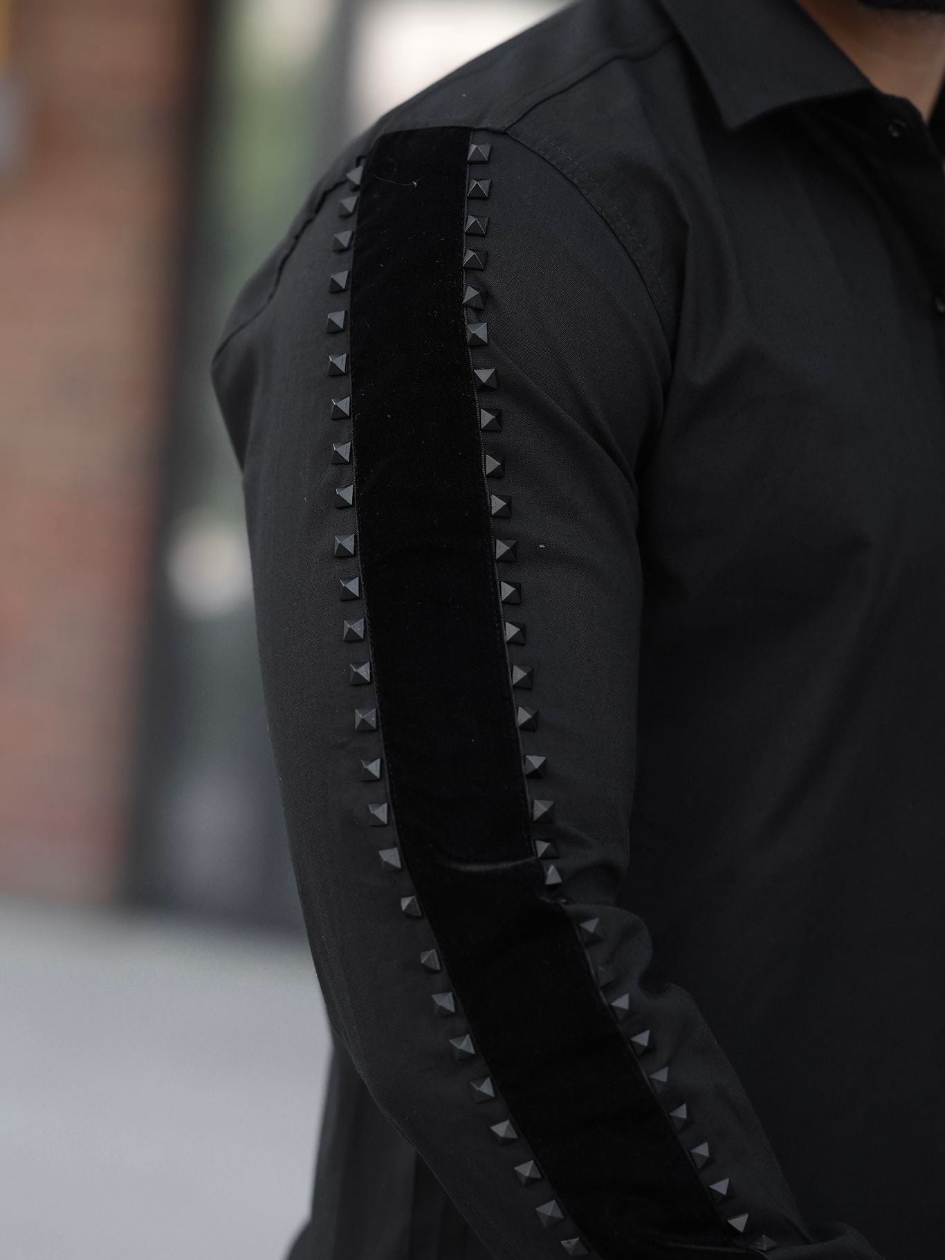 Cămașă bărbătească slim fit, complet neagră, evidențiată prin detaliile speciale de pe mâneci: o dungă din material tip catifea, decorată cu ținte piramidă pentru un efect modern și sofisticat. Materialul ușor elastic asigură confort, iar designul elegant oferă un plus de stil în orice ținută.