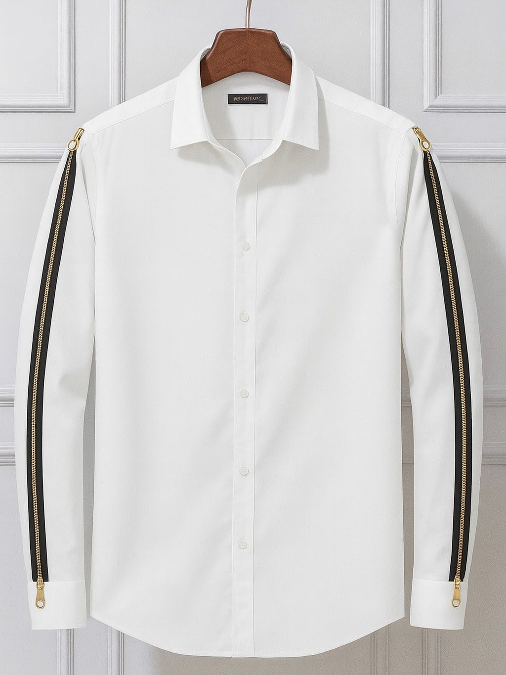 Cămașă modernă, elegantă, din material fin, accentuată de fermoare aurii pe mâneci pentru un look sofisticat și îndrăzneț. Ideală pentru evenimente sau ținute smart-casual cu personalitate.
