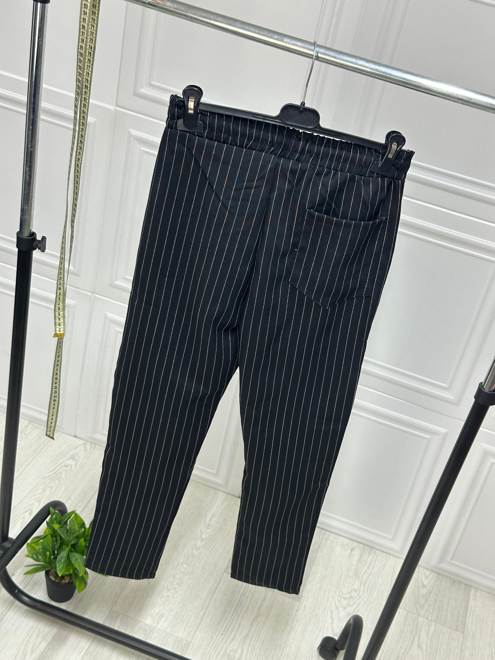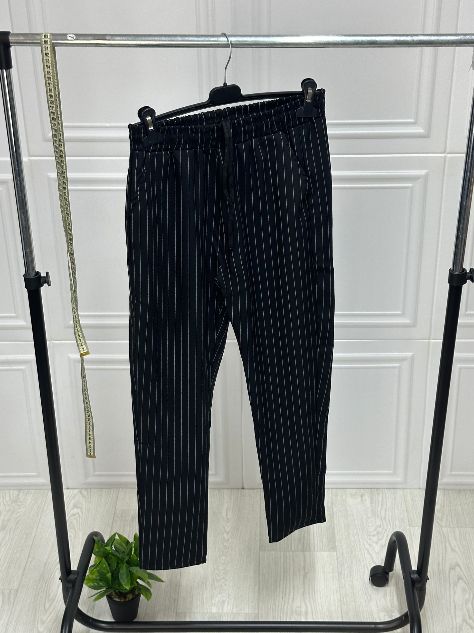 Pantaloni lejeri negrii , cu dungi verticale fine, talie elastică și șnur reglabil. Moderni, comozi și versatili — potriviți pentru ținute casual sau smart casual.