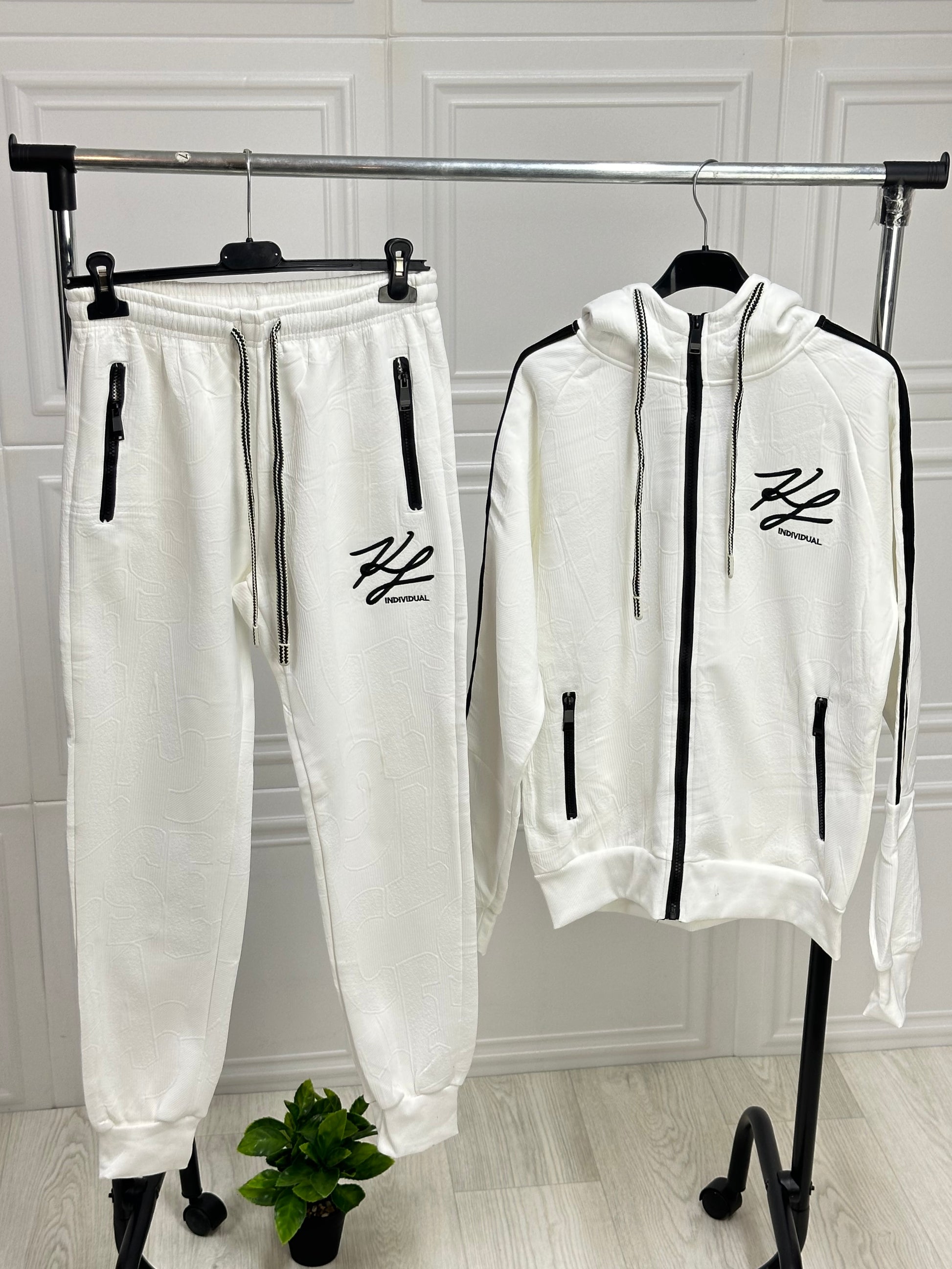 Trening alb elegant, cu textură discretă și detalii negre pentru un contrast modern. Hanorac cu fermoar, glugă și buzunare funcționale, pantaloni cu talie elastică și buzunare cu fermoar. Design minimalist, confort premium și stil urban rafinat. Perfect pentru ținute casual cu un touch de eleganță.
